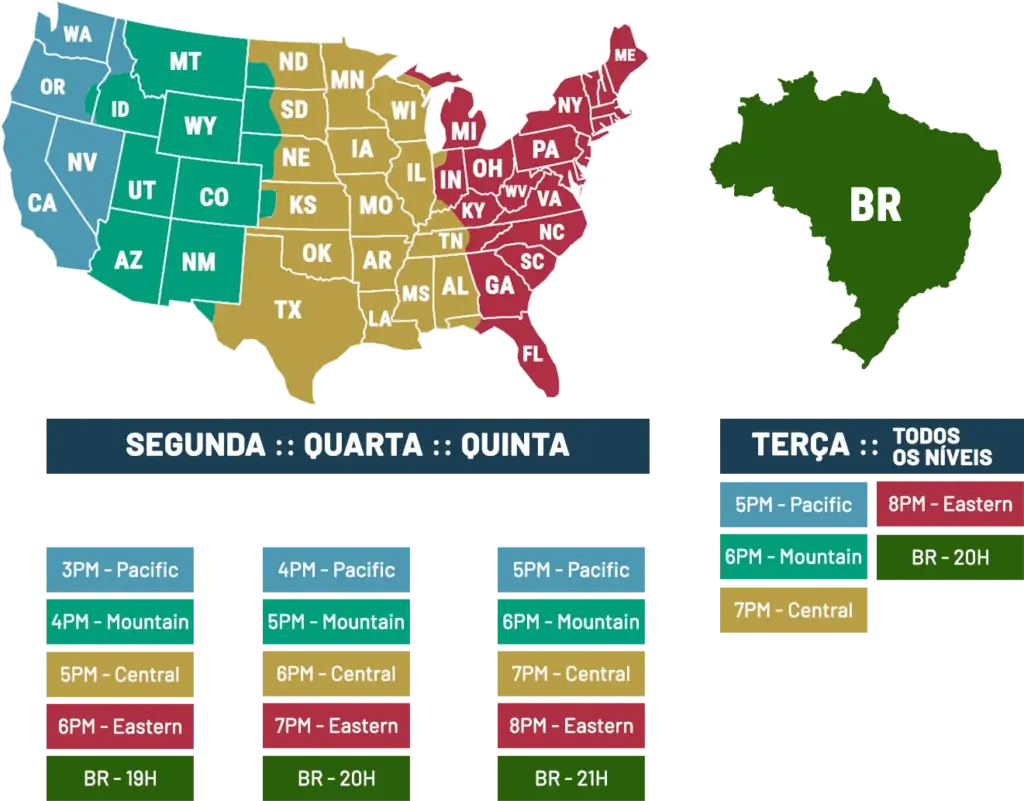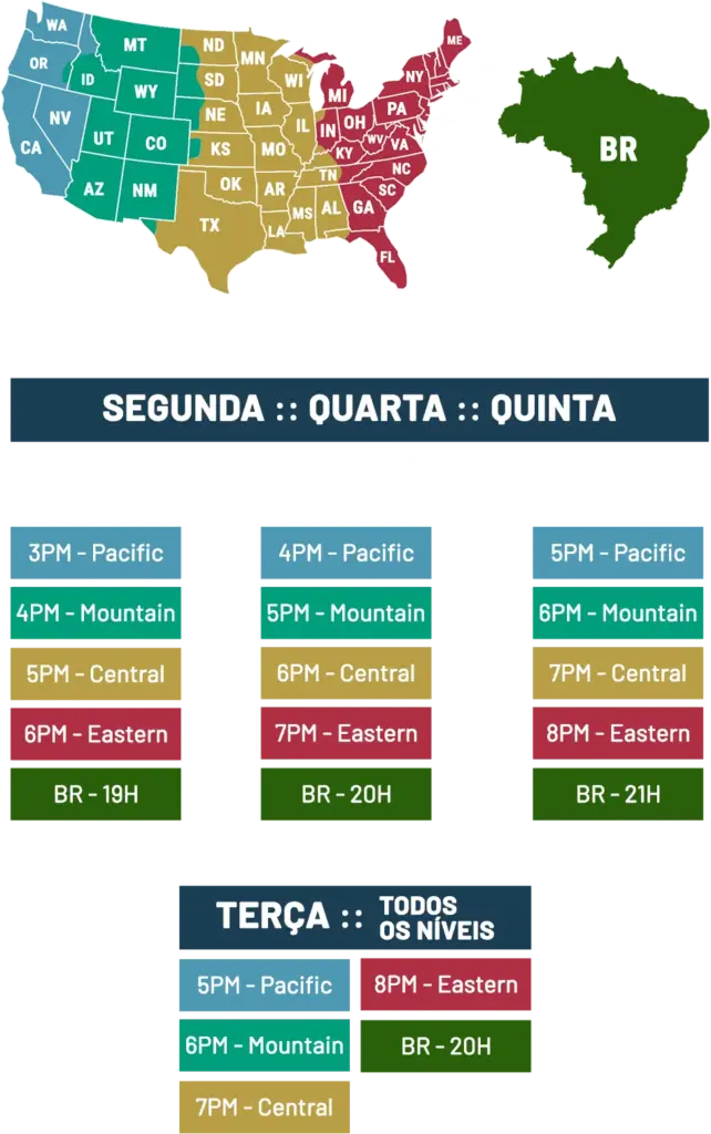 Toda terça-feira às 8PM EST, após a aula de conversação de inglês.